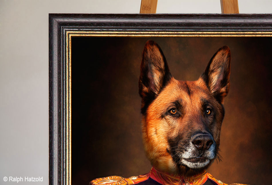 Fine Art Giclée Druck "Schäferhund in Uniform", pigmentiert, gerahmt in Massivholzrahmen, Berliner Leiste, gestempelt, signiert und nummeriert